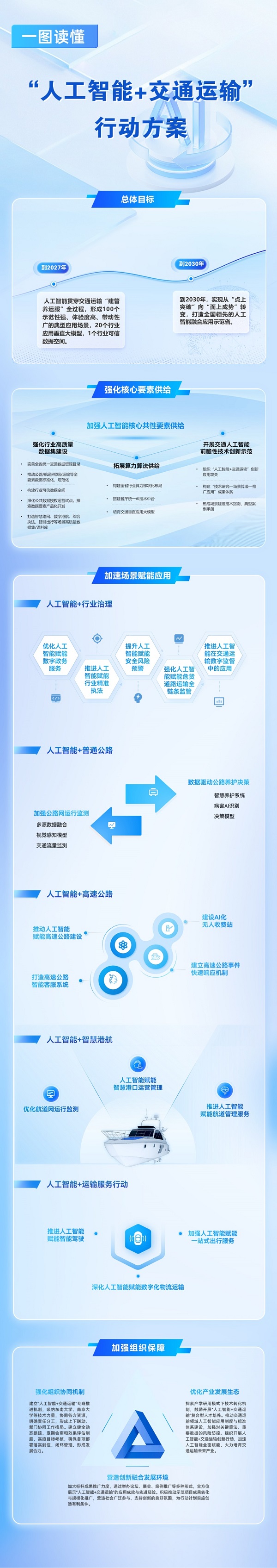 《方案》立足我省交通現(xiàn)狀及優(yōu)勢,發(fā)揮交通業(yè)務(wù)場景多樣、數(shù)據(jù)資源豐富等優(yōu)勢,圍繞強化核心要素供給、深化場景賦能應(yīng)用、加強組織保障三個方面部署23項任務(wù),并排出具體任務(wù)清單,從行業(yè)治理、普通公路、高速公路、智慧港航、運輸服務(wù)5個方面加速“人工智能+交通運輸”創(chuàng)新應(yīng)用。