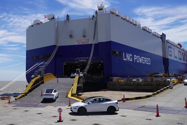 在上海自貿(mào)試驗(yàn)區(qū)臨港新片區(qū)南港碼頭,一批新能源汽車駛向一艘滾裝貨輪。新華社記者 楊有宗 攝